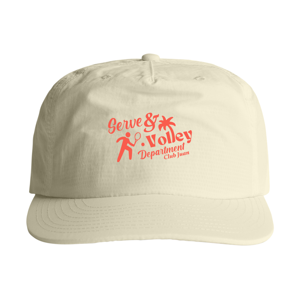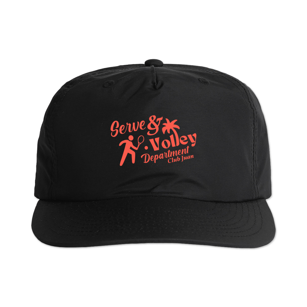 Mid profile, snapback cap with light weight 100% recycled nylon. Features CJ's Serve & Volley design printed on the front.