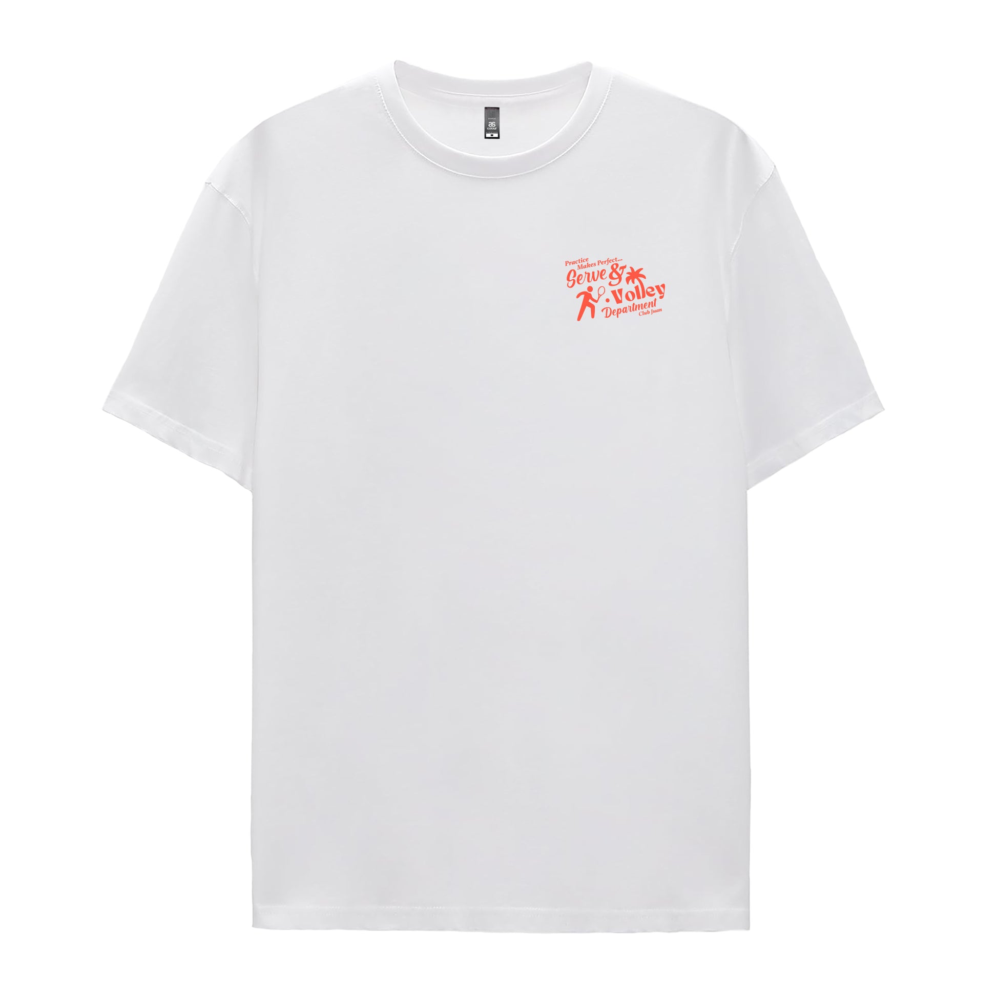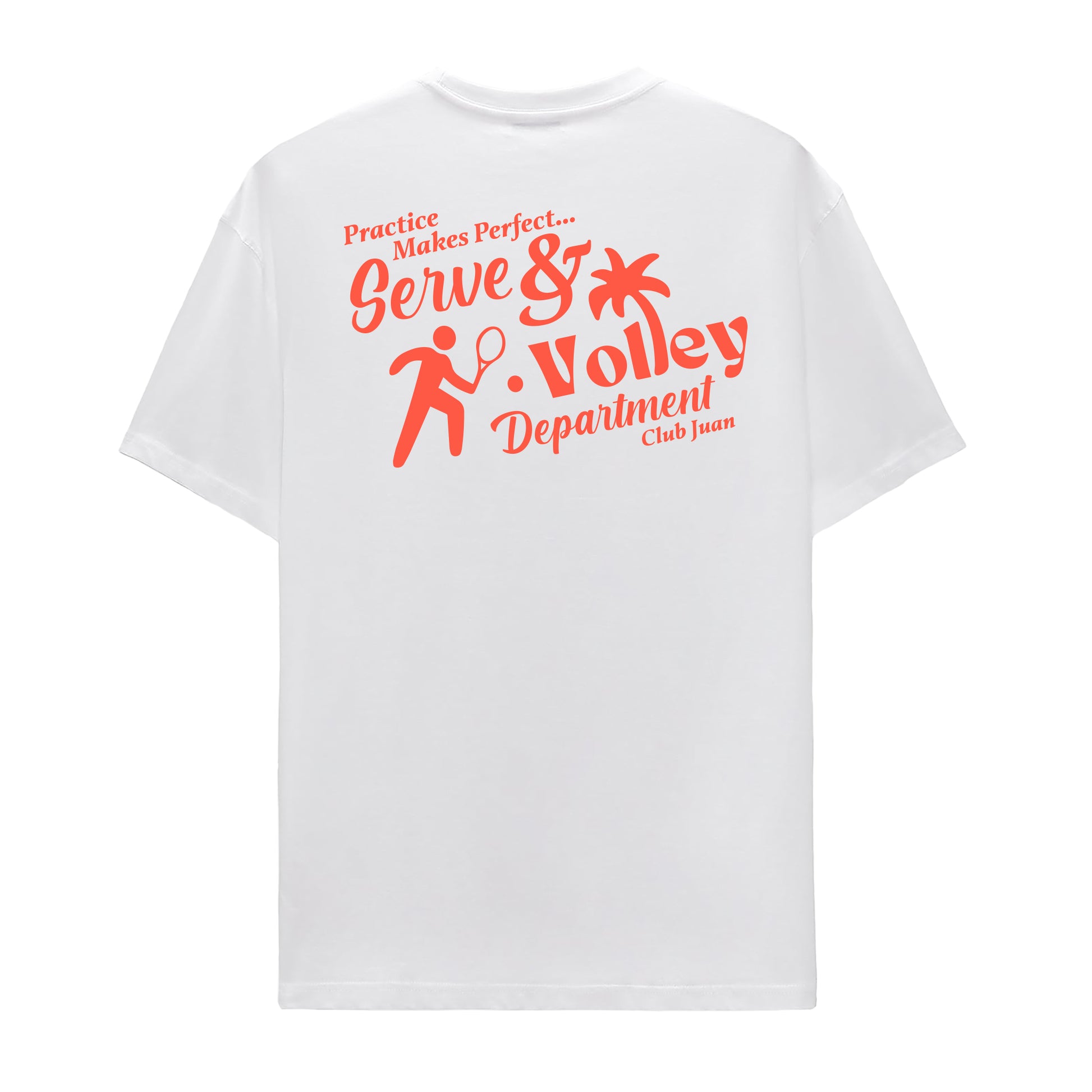 Cotton tee shirt with a ribbed neckline and short sleeves. Features CJ's Serve & Volley design printed on front and back.