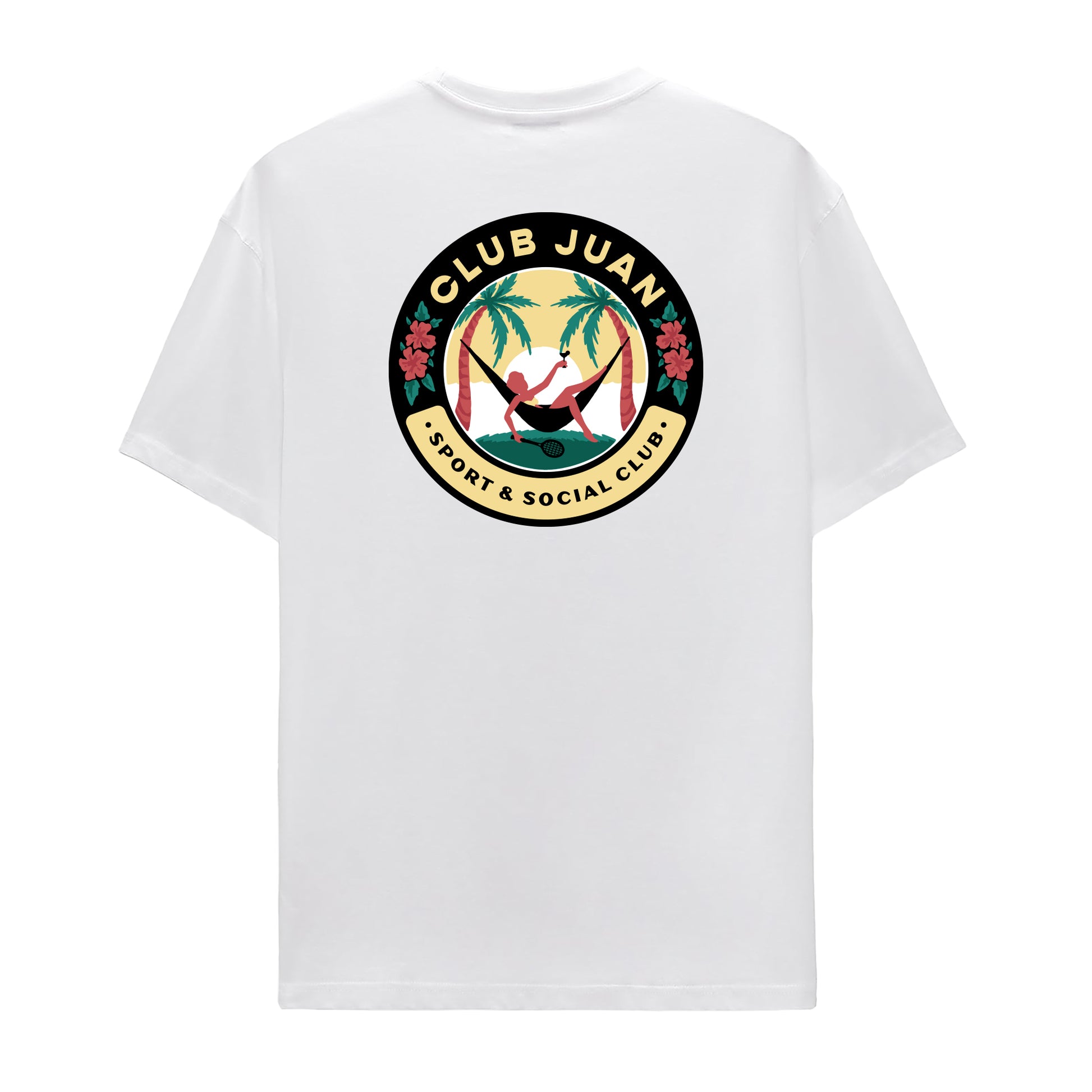Cotton tee shirt with a ribbed neckline and short sleeves. Features CJ's Sport & Social Club design printed on front and back.