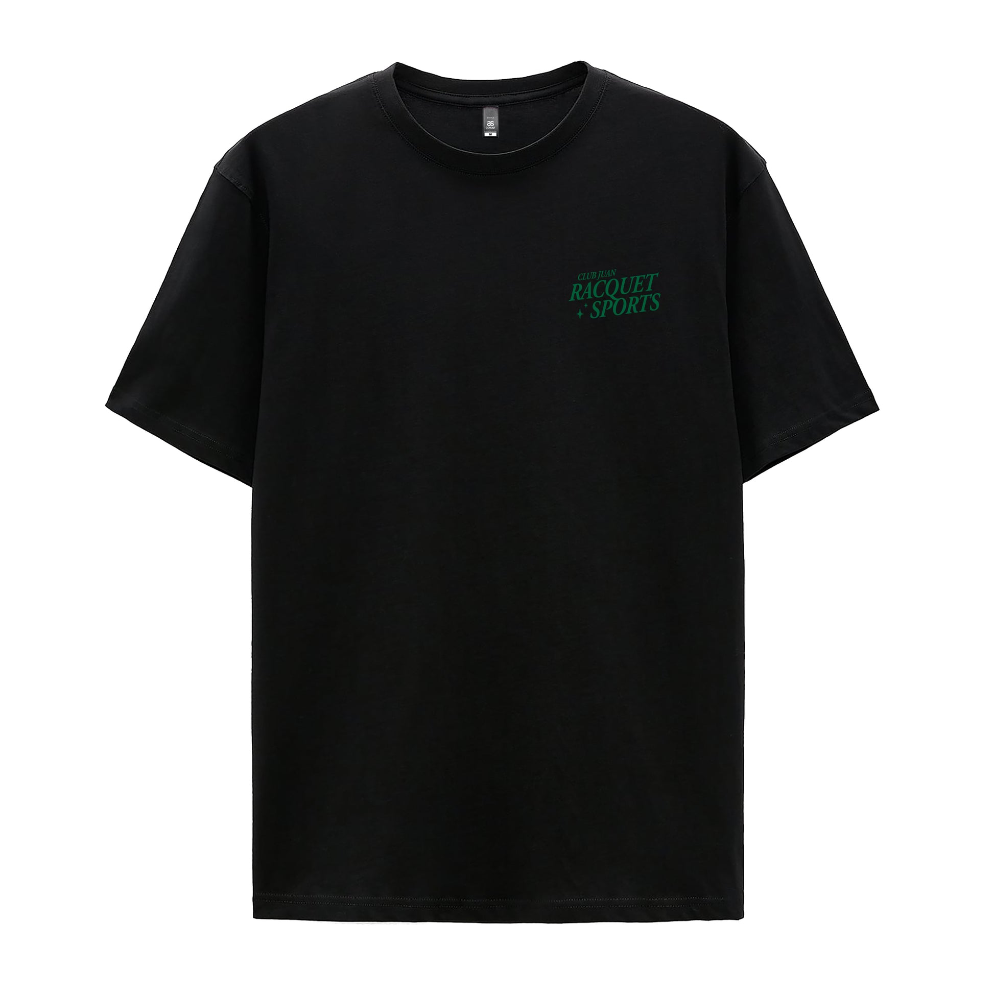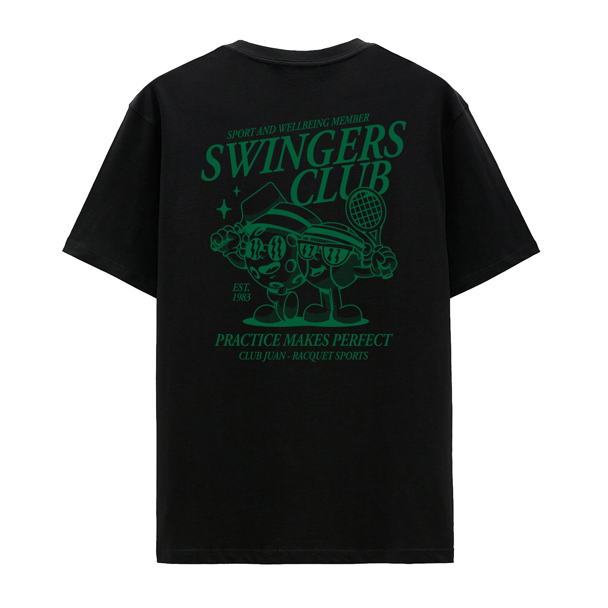 Cotton tee shirt with a ribbed neckline and short sleeves. Features CJ's Swingers Club design printed on front and back.