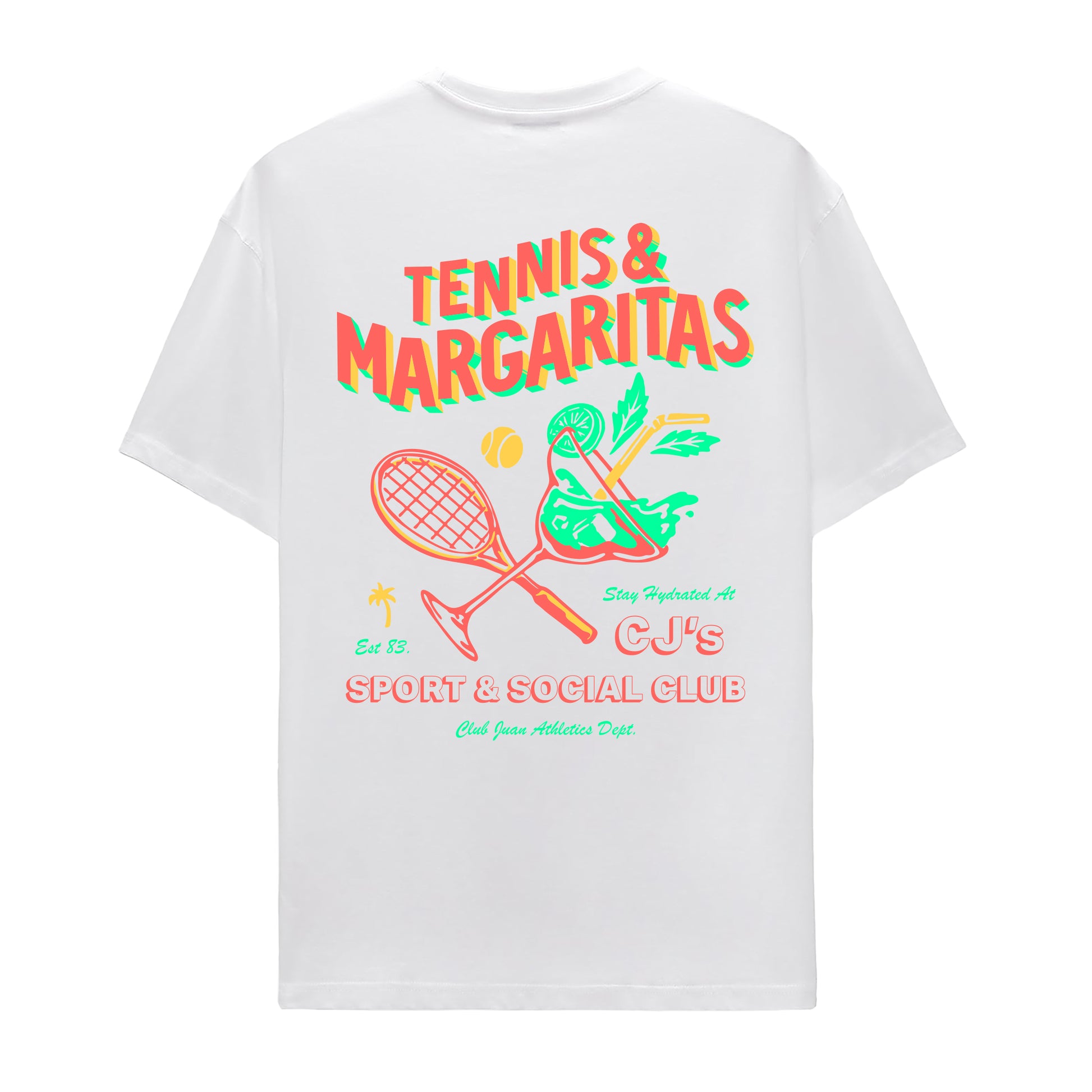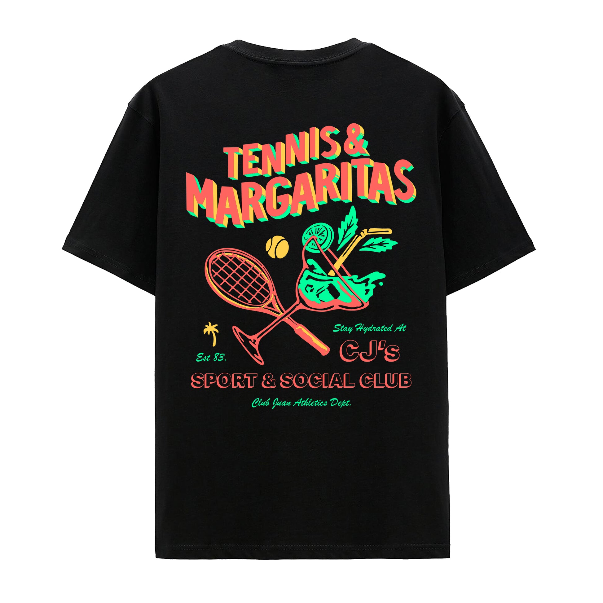 Cotton tee shirt with a ribbed neckline and short sleeves. Features CJ's Tennis & Margaritas design printed on front and back.